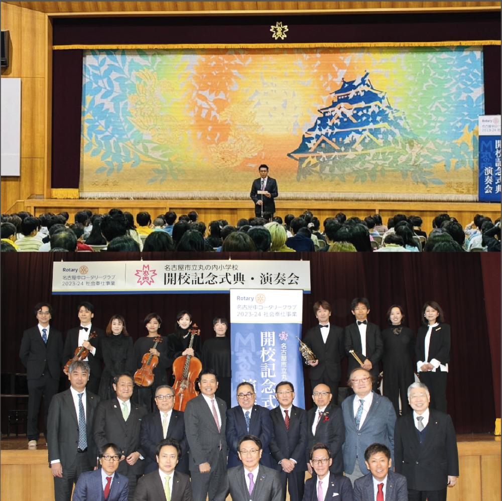 1871年に設立され名古屋で最も古い歴史を有する名城小学校と1961年に名城小学校の分校として誕生した御園小学校が統合され2023年4月1日に開校した丸の内小学校の開校記念式典において、名古屋フィルハーモニー交響楽団所属の演奏者9名による演奏会を開催しました。その中で、丸の内小学校の新校歌を生演奏で児童が合唱、併せて、名城小学校、御園小学校出身の中クラブ会員が、児童に対して、両小学校での思い出、統合後の新小学校への期待を伝えるという内容です。