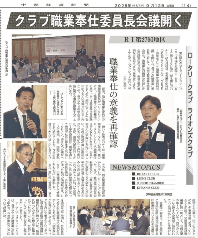 国際ロータリー第2760地区がクラブ職業奉仕委員長会議を開催した様子が中部経済新聞に掲載されまし。