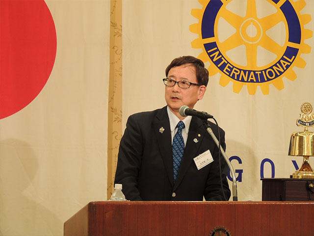 また、本年度の地区方針「あなたの街でロータリーを!あなたの街からロータリーを!」と「ロータリーの奉仕の理念を学び、奉仕の実践をしよう」という副題を掲げられ、奉仕の理念である「思いやりの心」こそが大切で、これに加え倫理観と高潔性の重要性と、奉仕の学びの場である例会出席と他クラブへの例会出席で分区内の交流を深めて多様性と寛容の精神を持って欲しい、そうすることで交流が刺激となり、前進する活力となり、ロータリアンとして発信することこそ「インスピレーションになる」ということであるとお話いただきました。