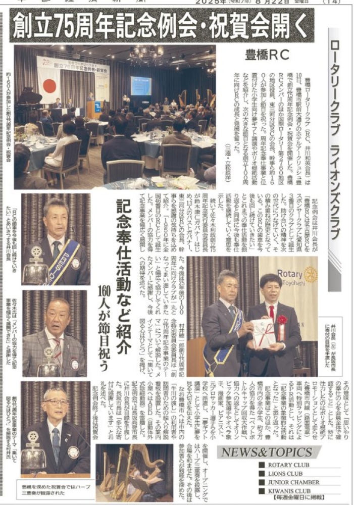 中部経済新聞掲載記事-豊橋ロータリークラブ創立75周年記念例会・祝賀会