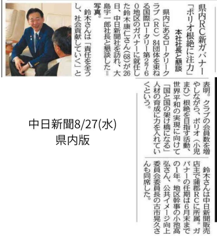 鈴木ガバナーは中日新聞の販売店ということもあり、お互いによくご存じの仲で、話も弾んでいました。